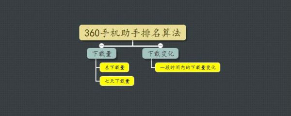 360手机助手的算法排名偏重于下载量,包括下载量的趋势变化,其算法排名机制是总下载量、七天下载量、下载量变化趋势。由此我们可以看出,360手机助手的排名算法并不复杂,即下载量越多的应用程序,理论上就是一款受用户认可的应用程序,因此应用商店必须给其相应的高排名。