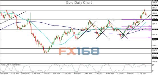 但由于朝鲜周末未能如期发射导弹,现货黄金本周一(9月11日)开盘闪崩逾10美元,并触及1334.30美元/盎司的日内低位,随后收窄跌幅至1338美元附近交投。