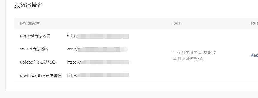 ④.使用图片上传功能,需要配置小程序账号的合法域名,如下图,需将四个域名都配置成绑定的域名。如果设置成功了,但开发模式如报错:fail url not in domain list ,这个问题只需提交小程序发布审核通过之后就可以了。