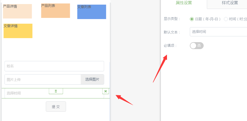 ②.选择日期选择器,右侧属性设置可以设置日期的显示类型,有日期和时分两种选择