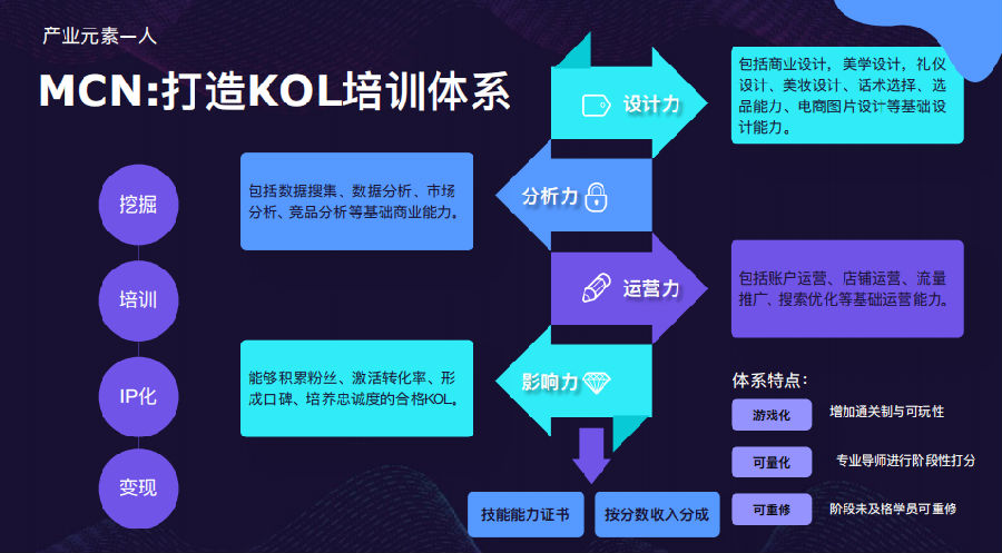 MCN机构,通过打造KOL培训体系,从设计力、分析力、运营力、影响力等多维度孵化KOL。