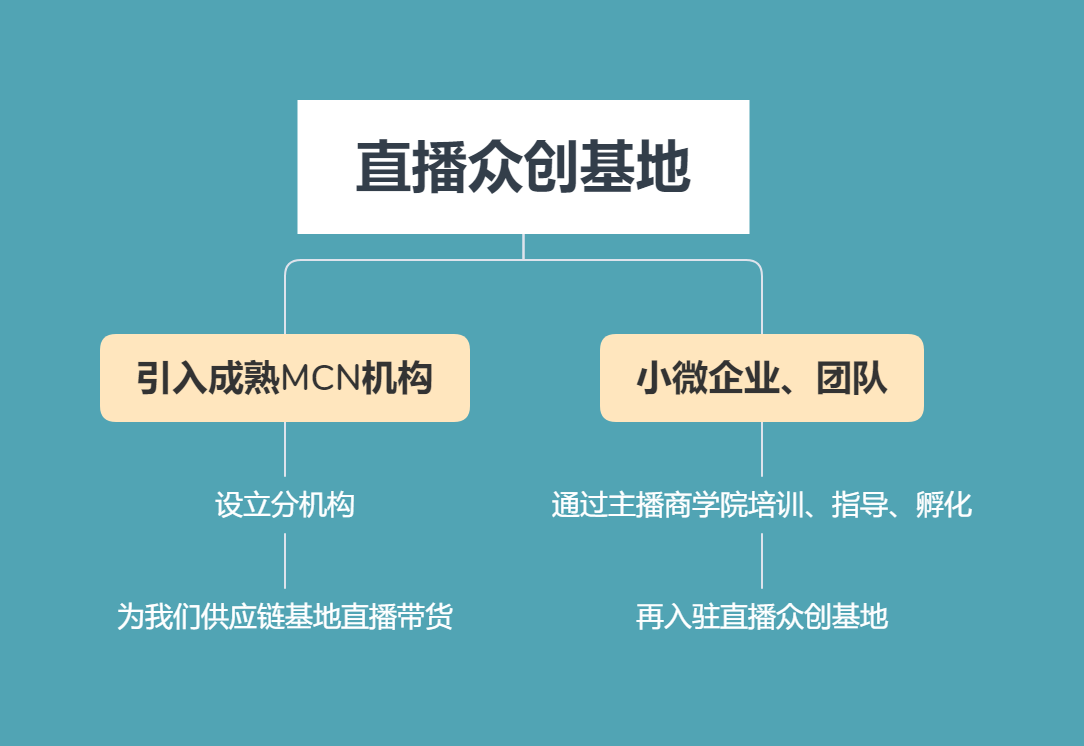 1.直播众创基地:通过提供免费办公场地、办公用具、员工宿舍,人才补贴,资金扶持等,吸引外部成熟的MCN机构入驻,同时对接本地优质品牌供应链端,让当地直播带货业务快速发展起来,同时也欢迎小微企业及团队通过直播商学院培训、指导、孵化后入驻直播众创基地。
