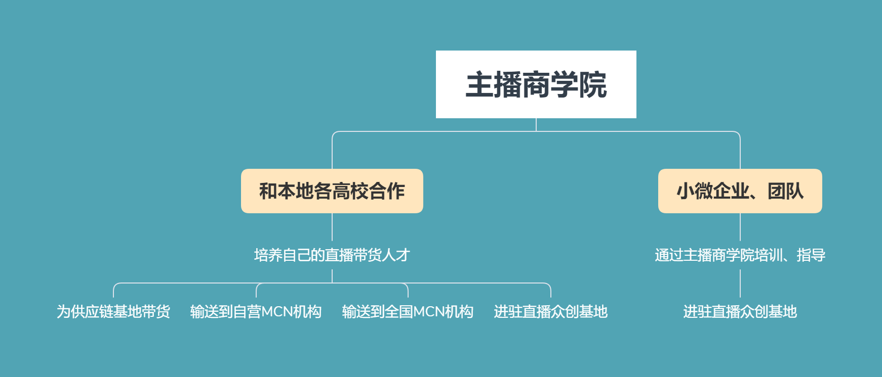 3.主播商学院:通过实际落地的MCN机构,挖掘在一线的实战直播带货达人入驻商学院,成为第一批直播培训导师,再与本地各高校导师合作,培育出自己的直播带货人才,输出为供应链基地带货、输送到自营MCN机构以及全国合作的MCN机构、进驻直播众创基地等。
